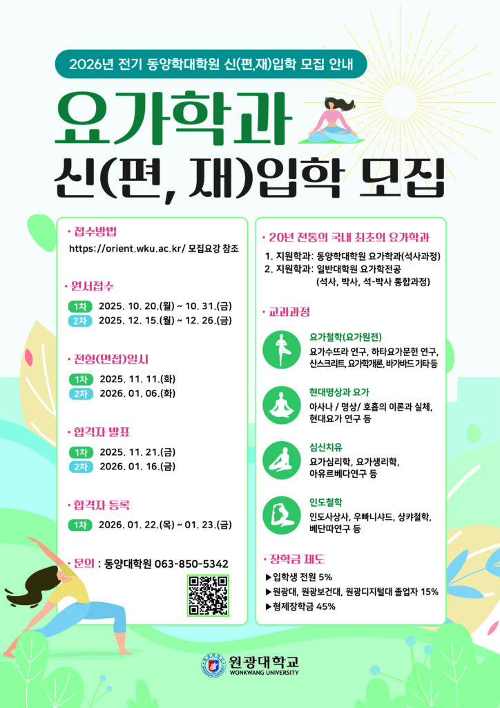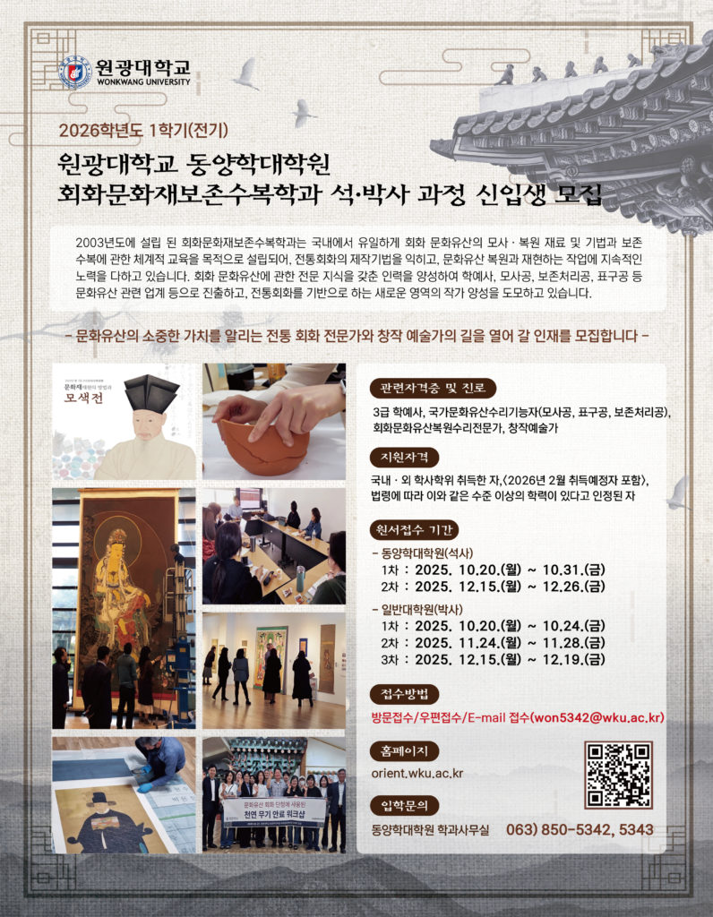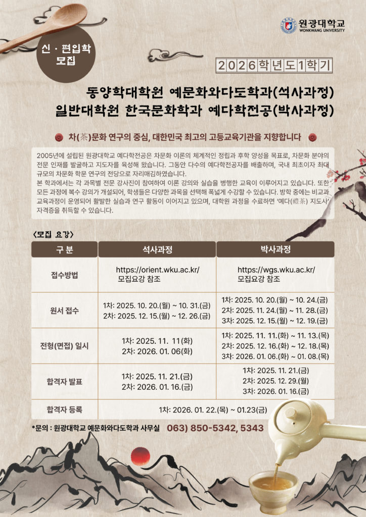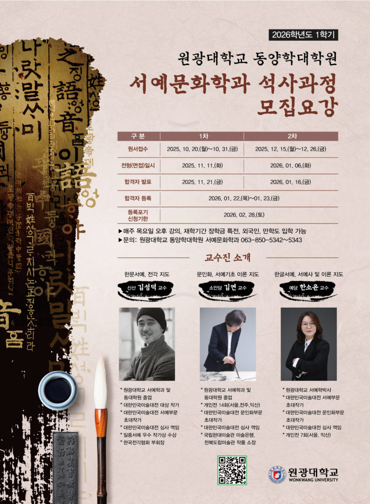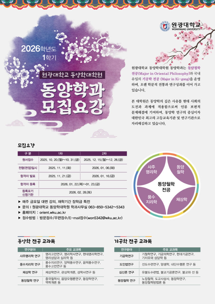 공지사항 홈게시판공지사항 [입학] 동양학대학원 홍보 포스터 모음 [입학] 동양학대학원 홍보 포스터 모음 동양학대학원2025-10-14 페이스북 트위터 구글플러스 이메일 프린트 [동양학과] 동양학과 커리큘럼 바로가기(클릭) [서예문화학과] 서예문화학과 커리큘럼 바로가기(클릭) [예문화와다도학과] 예문화와다도학과 커리큘럼 바로가기(클릭) [요가학과] 요가학과 커리큘럼 바로가기(클릭) [회화문화재보존수복학과] 회화문화재보존수복학과 커리큘럼 바로가기(클릭) 이전공지사항